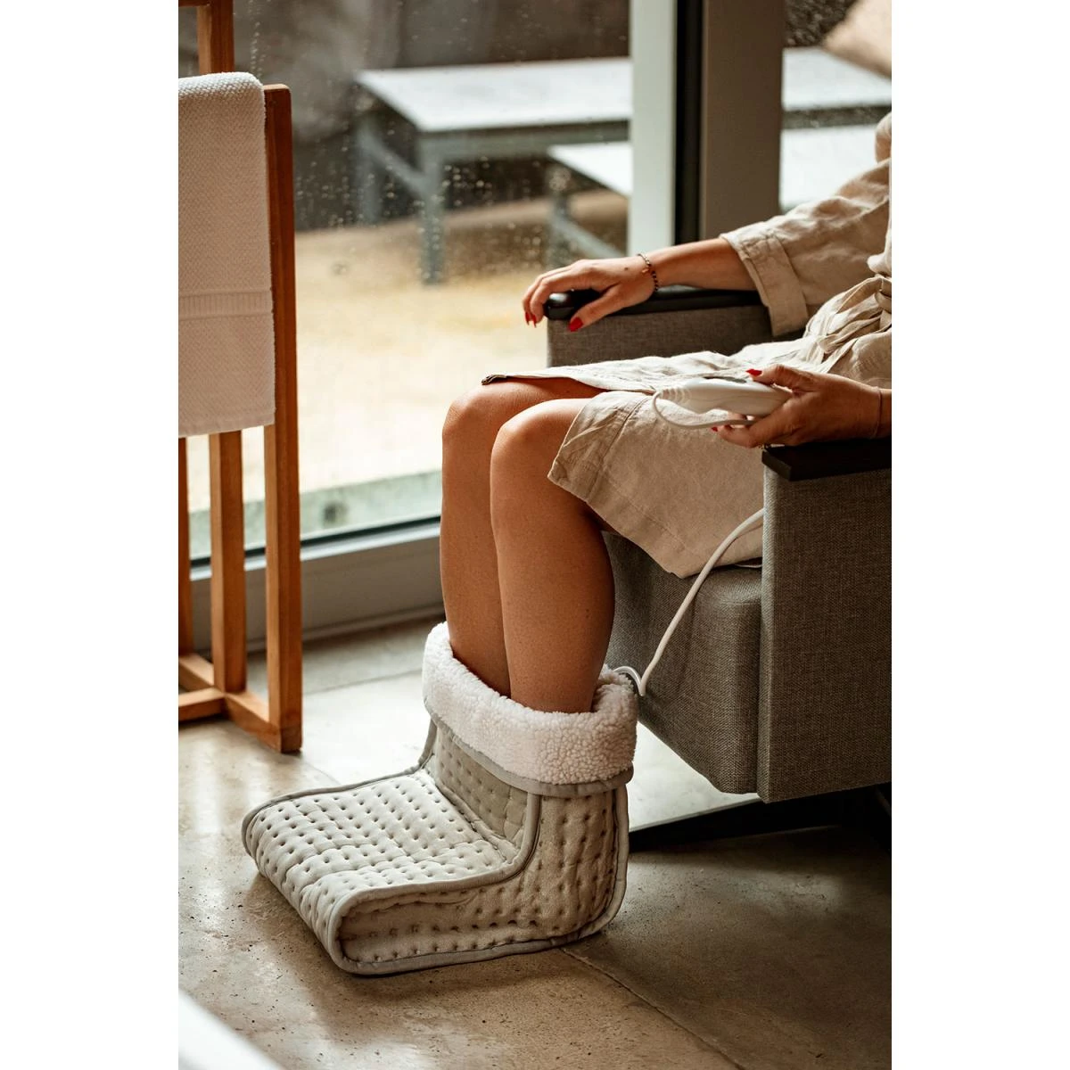 6 NIVEAUX DE TEMPERATURE : à partir de l’appareil à affichage numérique, vous pouvez sélectionner le niveau de température souhaité. Insérez vos pieds dans l’appareil et profitez de la sensation agréable d’avoir les pieds chauds les jours les plus froids. POUR TOUTES LES TAILLES : même les grands pieds tiennent dans le spacieux chauffe-pieds. Convient à une chaussure de taille 46. RÉCHAUFFEMENT RAPIDE, grâce à sa puissance de 100W, l’appareil atteint le niveau de température indiqué en quelques minutes. TISSU D’INTERIEUR DOUX ET LAVABLE, en laine synthétique très douce et agréable, peut être enlevé et lavé à la main à 40ºC. SÉCURITÉ TOTALE : l’appareil est doté d’un système de protection contre la surchauffe et s’éteint automatiquement après 90 minutes de fonctionnement.