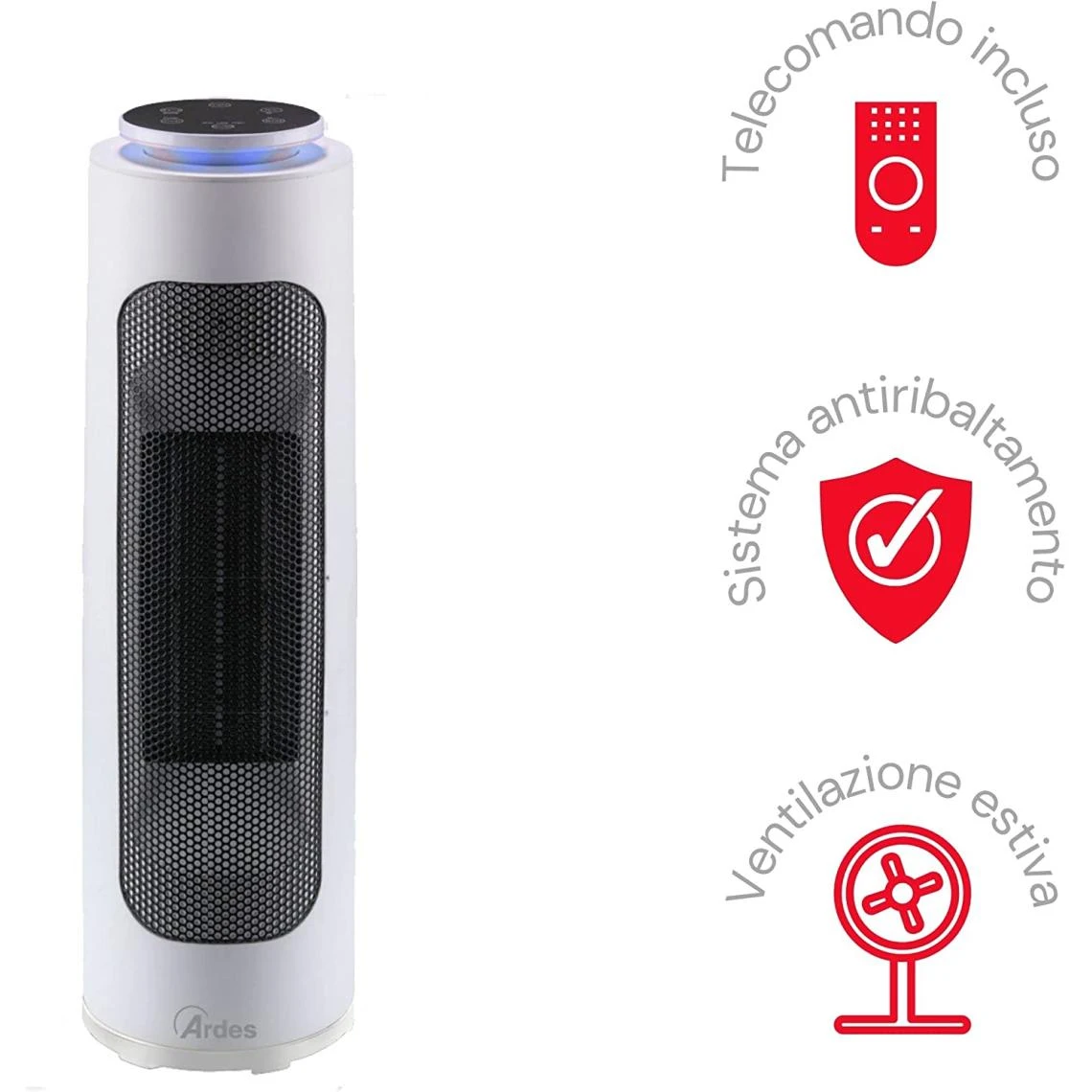 Ardes AR4P20 OBLIVION Termoventilatore Ceramico Digitale a Torre Oscillazione Automatica e Verticale 2 Potenze e Timer 12 ore, con Display LCD Touch, 2000 W Termoventilatore torre oscillante con doppia funzione automatica e inclinazione verticale a 2 livelli di potenza regolabili tramite display digitale Con display touch per la regolazione della temperatura ottimale e dell’autospegnimento con timer 12 ore Sicuro e stabile grazie alla protezione anti ribaltamento e surriscaldamento Elegante e potente dal design italiano con frontale black e retro total white Specifiche: altezza 51 centimetri, permette di scaldare velocemente un ambiente di circa 60 metri cubi ARDES Da 60 anni offriamo prodotti per la tua casa e cucina funzionali, sicuri, facili da usare, in grado di far fronte alle necessità di tutti i giorni.