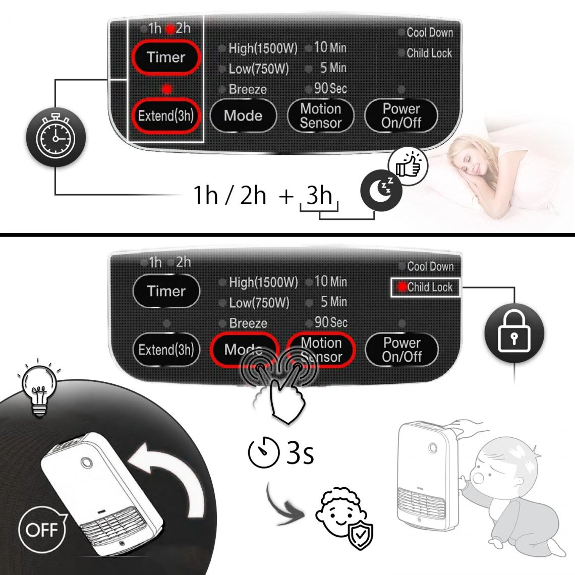 Réchauffez simplement et rapidement l’air de votre environnement grâce à ce chauffage d’appoint, idéalement conçu. Il dispose en effet de 3 puissances de chauffe à adapter en fonction de vos besoins mais également d’un capteur de mouvement. Ainsi, après un temps que vous définissez ( 90 secondes, 5 minutes ou 10 minutes ), l’appareil s’arrêtera automatiquement s’il ne détecte aucune présence sous un angle de 90°, assurant une véritable sécurité au sein de votre espace. Par ailleurs, il bénéficie d’une fonction de verrouillage, évitant tout dérèglement de l’appareil et gardant ainsi vos enfants à l’abri de tout accident domestique. Enfin, si l’appareil bascule vers l’avant, il s’arrêtera automatiquement vous faisant bénéficier une protection supplémentaire lors de son utilisation. Sa facade blanche brillante confère à cet appareil un esprit moderne et design qui s’intègrera parfaitement au sein de votre intérieur. Par ailleurs, son poids léger ( 2.5 kg ) facilite le transport d’une pièce à une autre, tandis que son format peu encombrant simplifie son rangement au sein d’un buffet, d’une armoire ou encore d’un dressing.