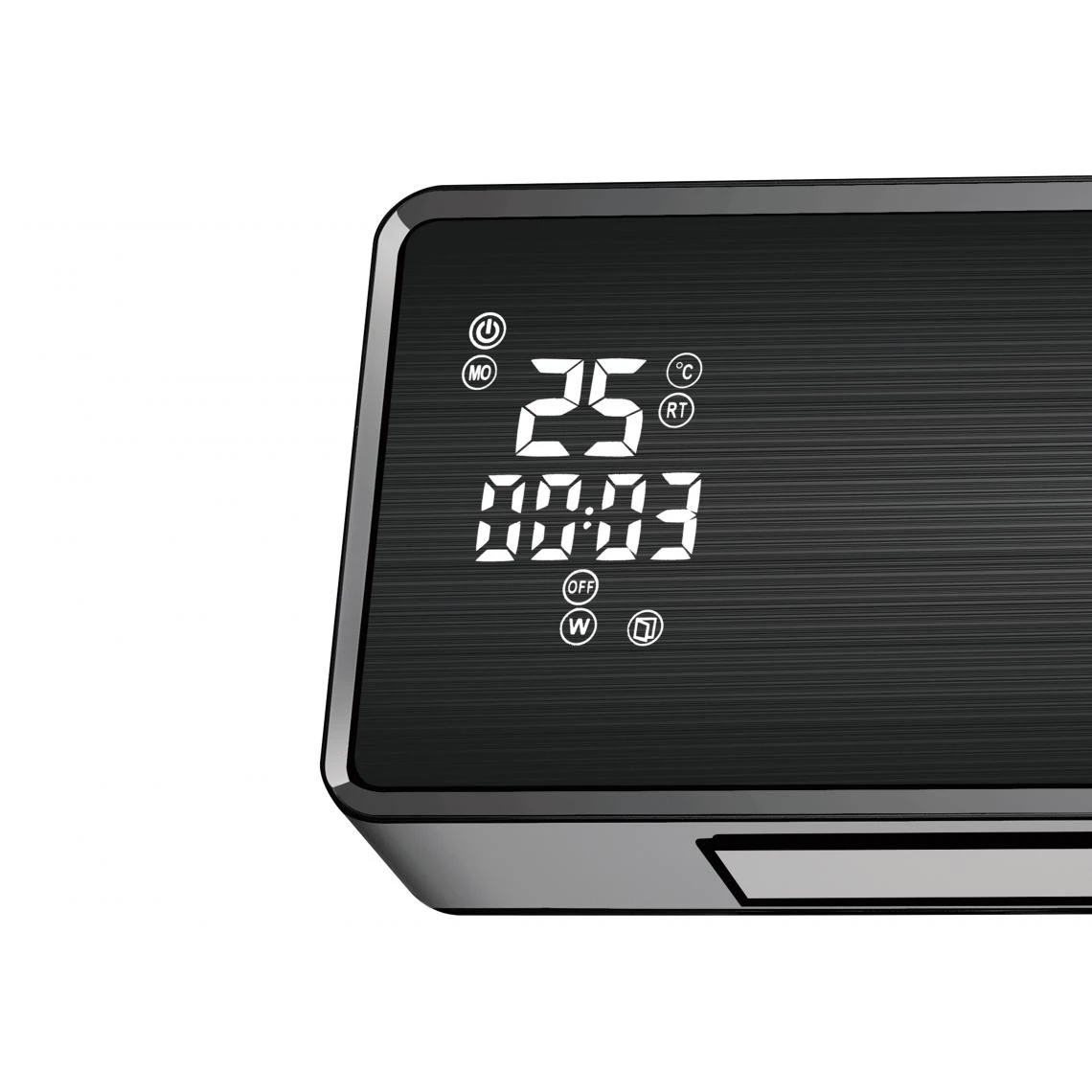 Son utilisation est très simple, il dispose d’un grand panneau digital LED à travers lequel vous pouvez contrôler la température et la programmer par heures et jours grâce à sa fonction de programmation hebdomadaire, vous pouvez également choisir le mode de fonctionnement qui s’adapte le mieux à vos besoins (ventilation, tempéré ou chaud). Parmi ses extras, vous trouverez la possibilité de le connecter au WIFI de votre maison et de le contrôler depuis l’appli TuyaSmart. D’un design noir élégant, compact (LxlxH : 45x11x18,5 cm) et léger (8kg), il est très facile à accrocher au mur, comprend une télécommande et chauffe des surfaces jusqu’à 20m2.